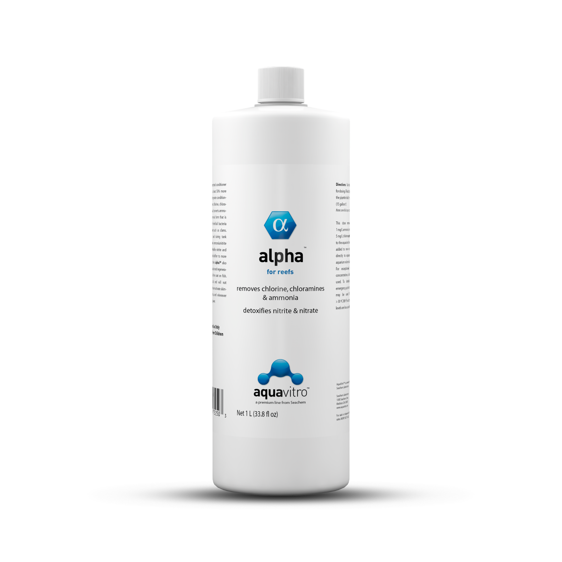 alpha™ is a concentrated conditioner for saltwater. It is 50% more active than our Prime® and 375% more active than the next closest competitor. alpha™ removes chlorine, chloramine and ammonia. It converts ammonia into a safe, non-toxic form that is readily utilized by beneficial bacteria and reef inhabitants such as clams. alpha™ may be used during tank cycling to alleviate ammonia/nitrite toxicity. alpha™ detoxifies nitrite and nitrate, allowing the biofilter to more efficiently remove them. alpha™ also promotes the production and regeneration of the natural slime coat on fish. alpha™ is non-acidic and will not impact pH, nor will it over activate skimmers. Use at start-up and whenever adding or replacing water.