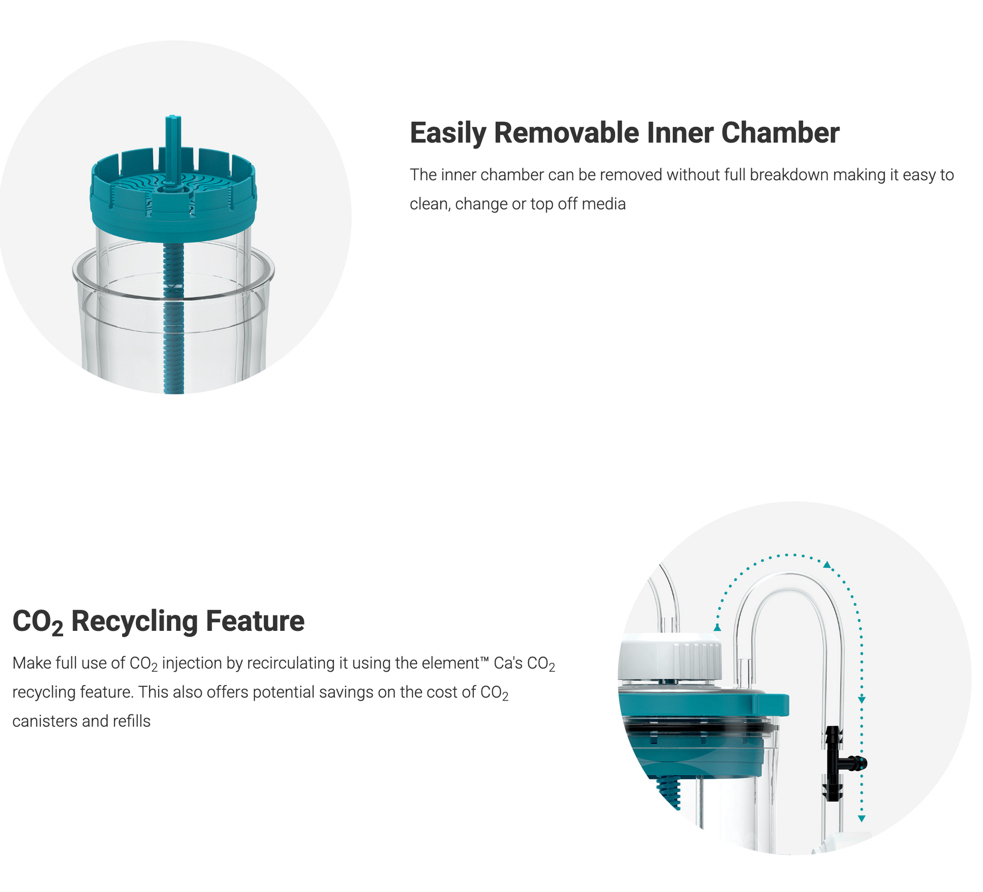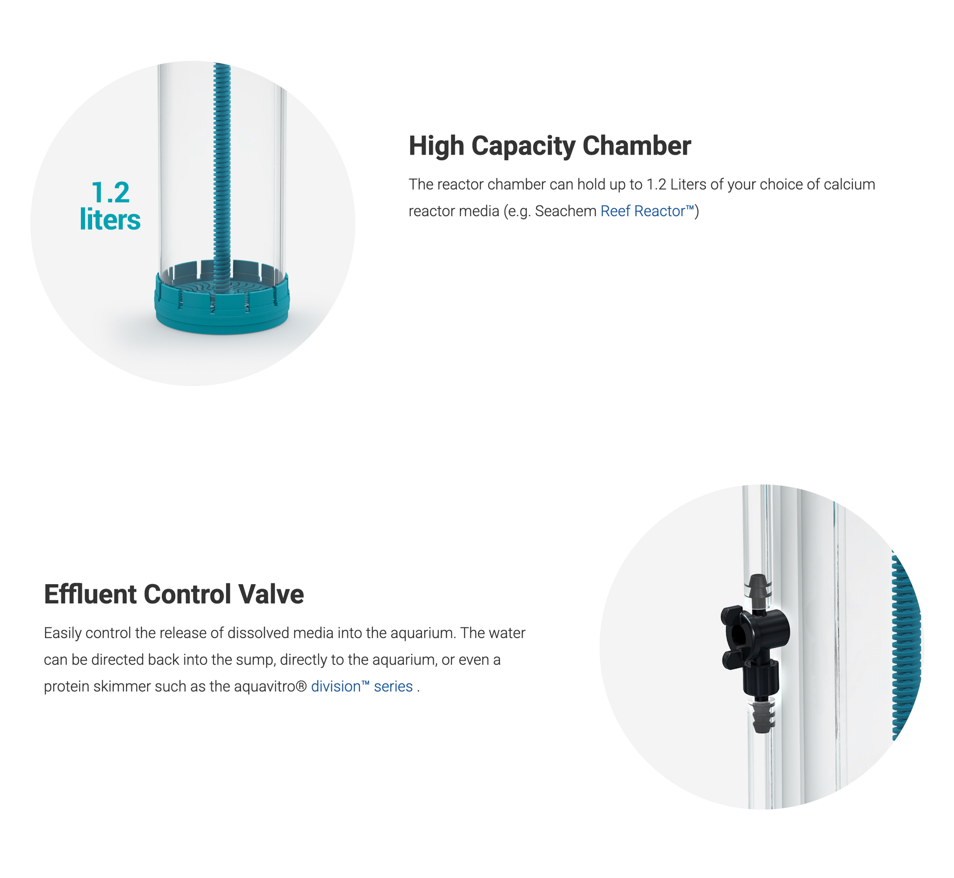 The element™ Ca Reactor provides and maintains a virtually constant calcium, magnesium and alkalinity ratio, which is critical to the long term success of reef aquaria. The element™ Ca Reactor functions by using CO2 to react with a calcium reactor media such as Seachem’s Reef Reactor™. CO2 acidifies the water flowing through the reactor and thereby dissolves the media which releases calcium, magnesium, carbonates among other elements and components of the chosen reactor media. A CO2 filled tank along with a pH probe and preferably a CO2 controlling system are required and/or highly recommended for proper functionality of the element™ Ca Reactor.