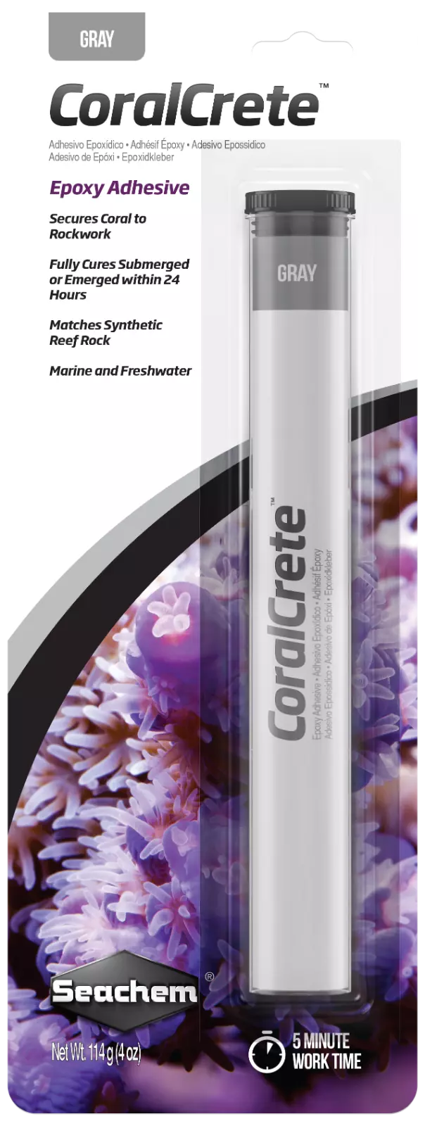 Seachem CoralCrete™ is two-part epoxy putty that can be used to secure coral to rockwork or to fuse together rockwork for more stable foundations in reef aquaria. It has a working time of 5 minutes which allows for plenty of work time while also quickly securing coral or rock. CoralCrete™ is ideal for working with larger colonies of branching coral, most large polyp coral or adhering plating coral to rockwork. CoralCrete™ is safe for aquarium inhabitants when used as directed.