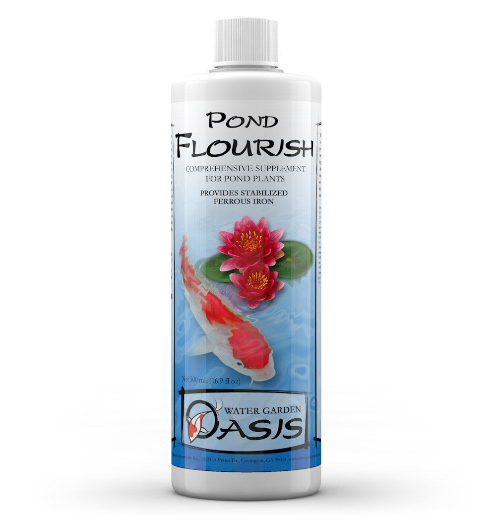 Pond Flourish is a liquid growth stimulator for pond plant stems and leaves. It contains a broad spectrum of essential trace elements, vitamins, and amino acids. It is rich in iron, manganese, magnesium, calcium, and potassium. It contains no phosphates or nitrates that would promote algae proliferation. A 2 Liter size treats over 100,000 US gallons.